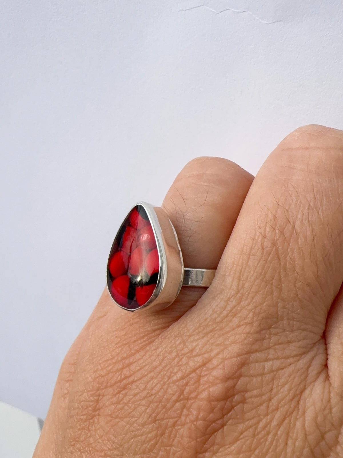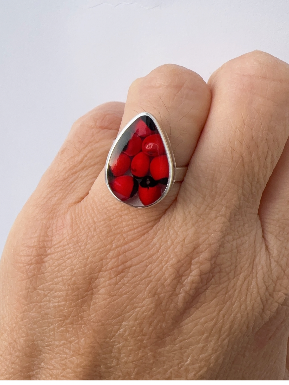 sortija (anillo) de huayruro con forma de gotaes una joya tradicional andina, especialmente peruana, que combina la semilla natural de huayruro (roja y negra) con un diseño moderno en metal plata simbolizando protección contra la mala energía, atracción de buena suerte y prosperidad, y representando la armonía entre lo ancestral y lo contemporáneo.