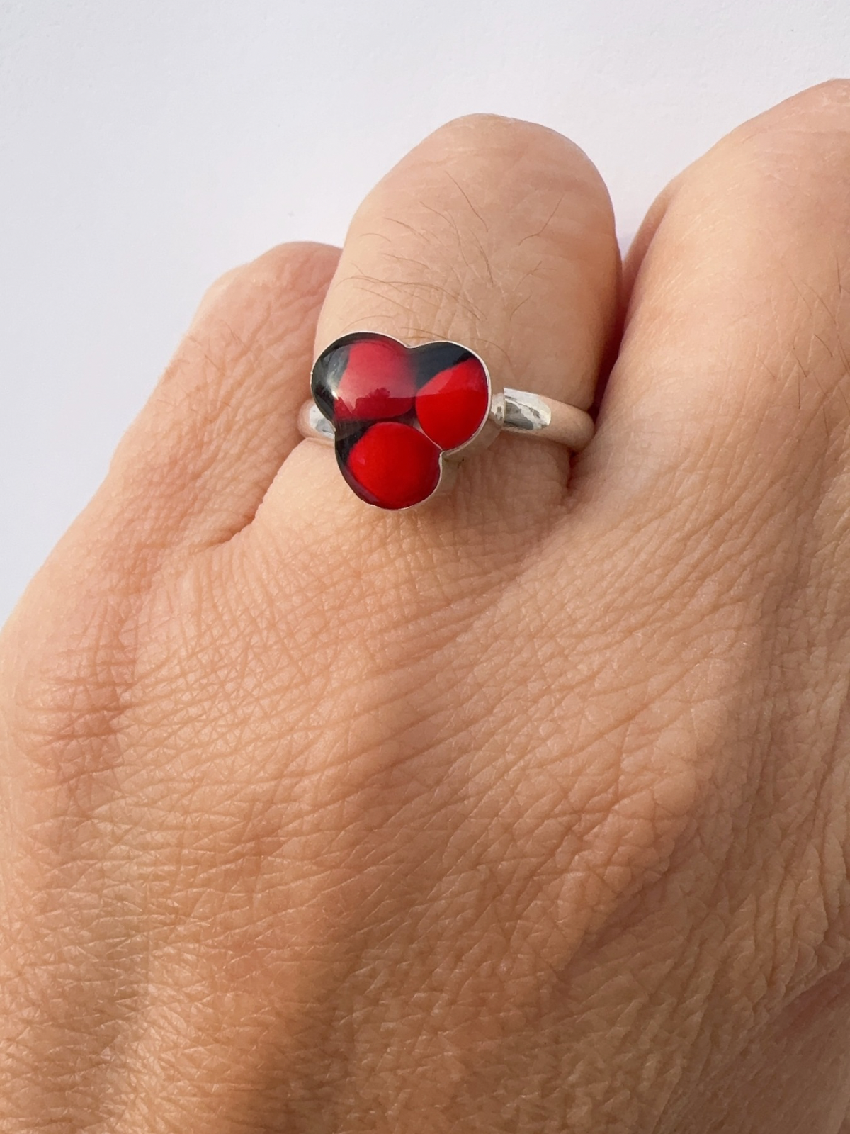 Preciosa sortija en plata con semillas de huayruro en trebol para la suerte y proteccion